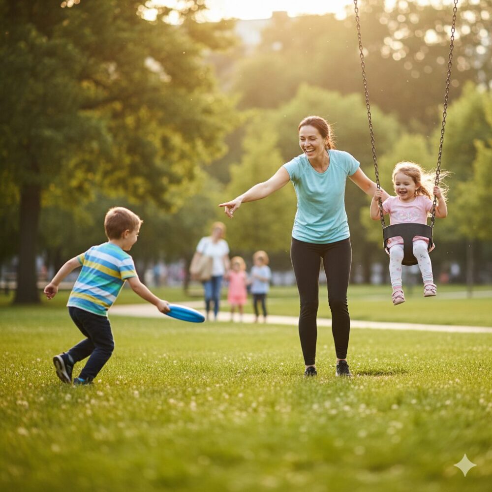 [Image: A woman smiling and playing with her child in a park. The photo conveys a healthy and happy atmosphere.]