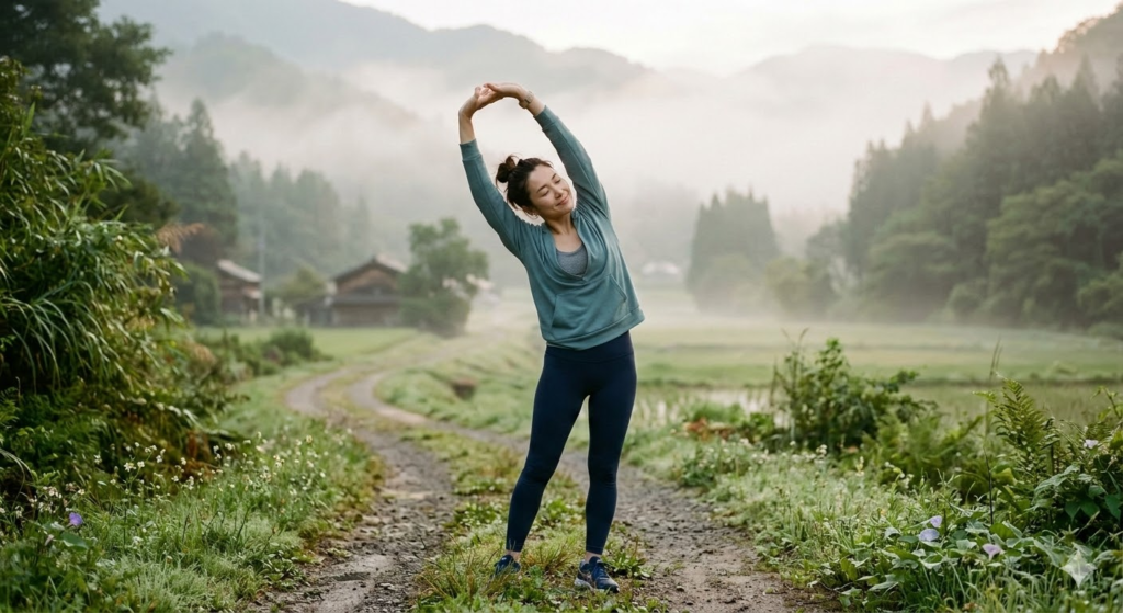 [Image: A realistic photo of a woman doing light stretches in the morning mist with a calm expression.]
