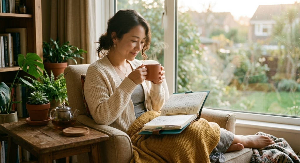 [Image: A realistic photo of a woman relaxing and looking at her planner while drinking warm herbal tea.]